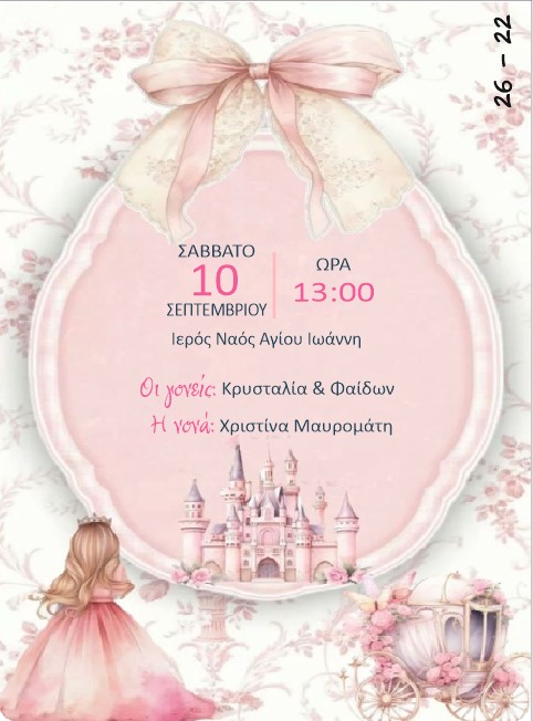 Το προσκλητήριο περιλαμβάνει όλες τις βασικές πληροφορίες (ημερομηνία, ώρα, εκκλησία, στοιχεία γονέων & νονού/νονάς) και μπορεί να προσαρμοστεί πλήρως σύμφωνα με τις επιθυμίες σας.