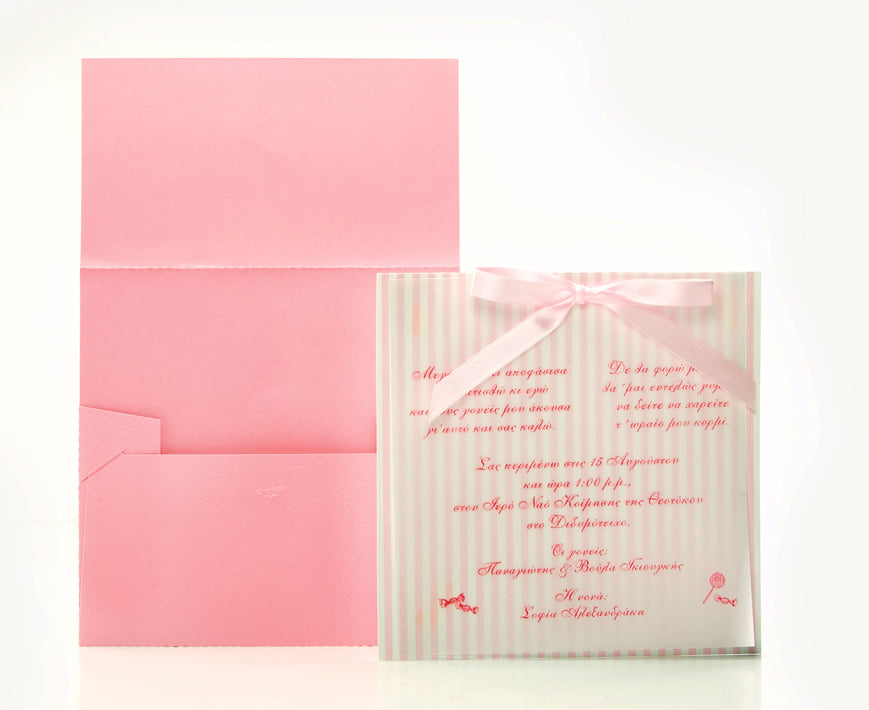 Το προσκλητήριο συνοδεύεται από ροζ φάκελο και προσωποποιείται πλήρως με τα στοιχεία της βάπτισης.