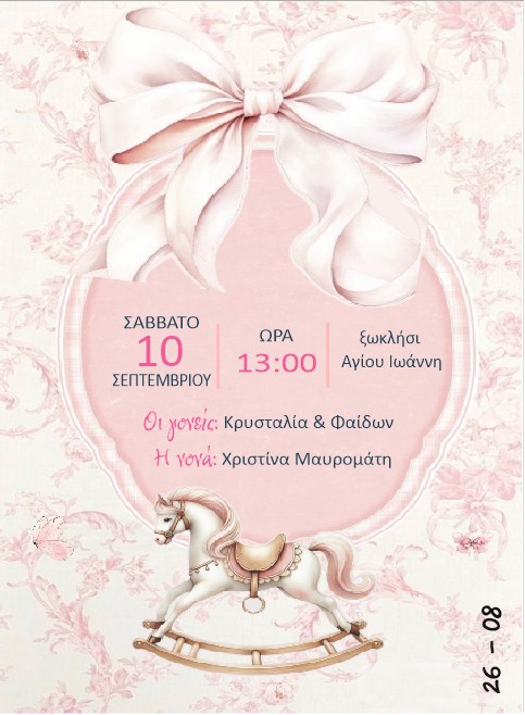 Το προσκλητήριο περιλαμβάνει όλες τις βασικές πληροφορίες (ημερομηνία, ώρα, εκκλησία, στοιχεία γονέων & νονού/νονάς) και μπορεί να προσαρμοστεί πλήρως σύμφωνα με τις επιθυμίες σας.