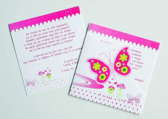 Ένα υπέροχο, φωτεινό και κοριτσίστικο προσκλητήριο βάπτισης με θέμα την πεταλούδα, σε αποχρώσεις ροζ, φούξια και παστέλ.
