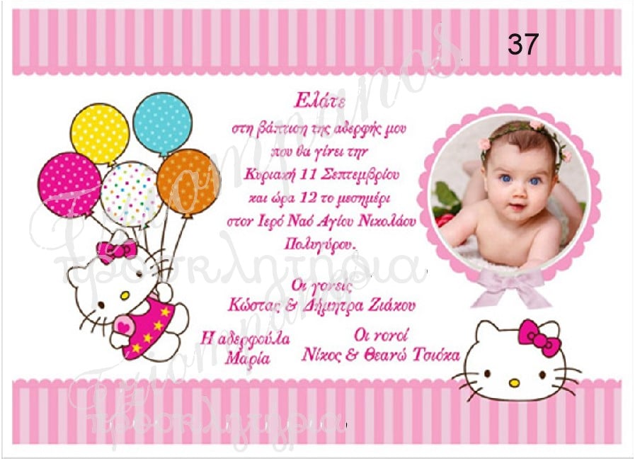 Ένα άκρως χαρούμενο και παιχνιδιάρικο προσκλητήριο βάπτισης με την αγαπημένη Hello Kitty, κρατώντας πολύχρωμα μπαλόνια, σε ροζ αποχρώσεις που ξετρελαίνουν μικρούς και μεγάλους.
