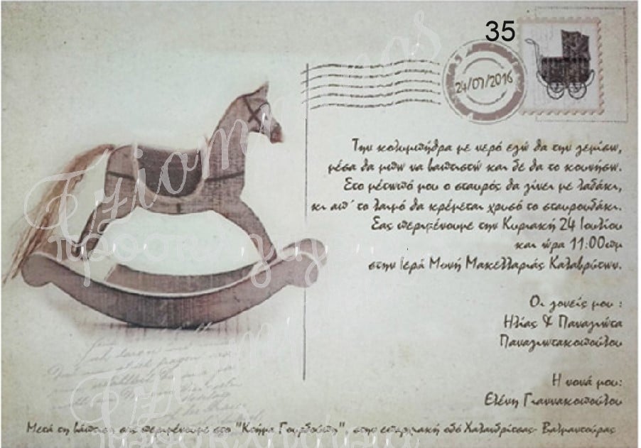 Το ξύλινο αλογάκι – σύμβολο παιδικών αναμνήσεων και αγνότητας – κάνει το προσκλητήριο ιδιαίτερα συναισθηματικό και ξεχωριστό.