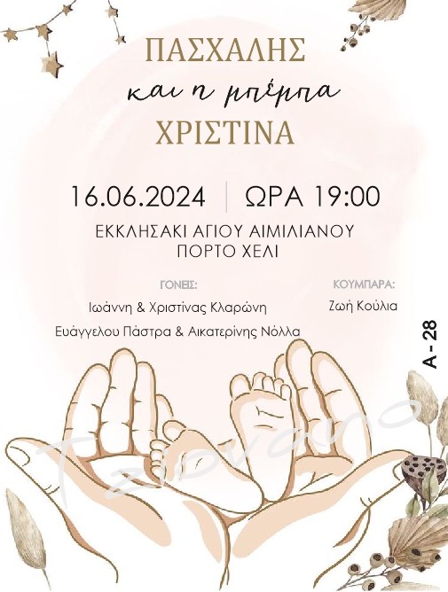 Ένα τρυφερό και συμβολικό προσκλητήριο γάμου και βάπτισης, με απαλά χρώματα και minimal αισθητική. Τα χέρια που αγκαλιάζουν τα μικρά πατουσάκια αποτυπώνουν την αγάπη, τη φροντίδα και την προστασία, ενώ οι γήινες αποχρώσεις και τα διακριτικά βοτανικά στοιχεία χαρίζουν κομψότητα και ηρεμία.