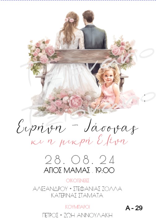Το σχέδιο απεικονίζει το ζευγάρι καθισμένο σε παγκάκι, πλαισιωμένο από απαλά ροζ άνθη, ενώ μπροστά ξεχωρίζει η μικρή τους κόρη, προσδίδοντας συγκίνηση και ζεστασιά στο κάλεσμα.
