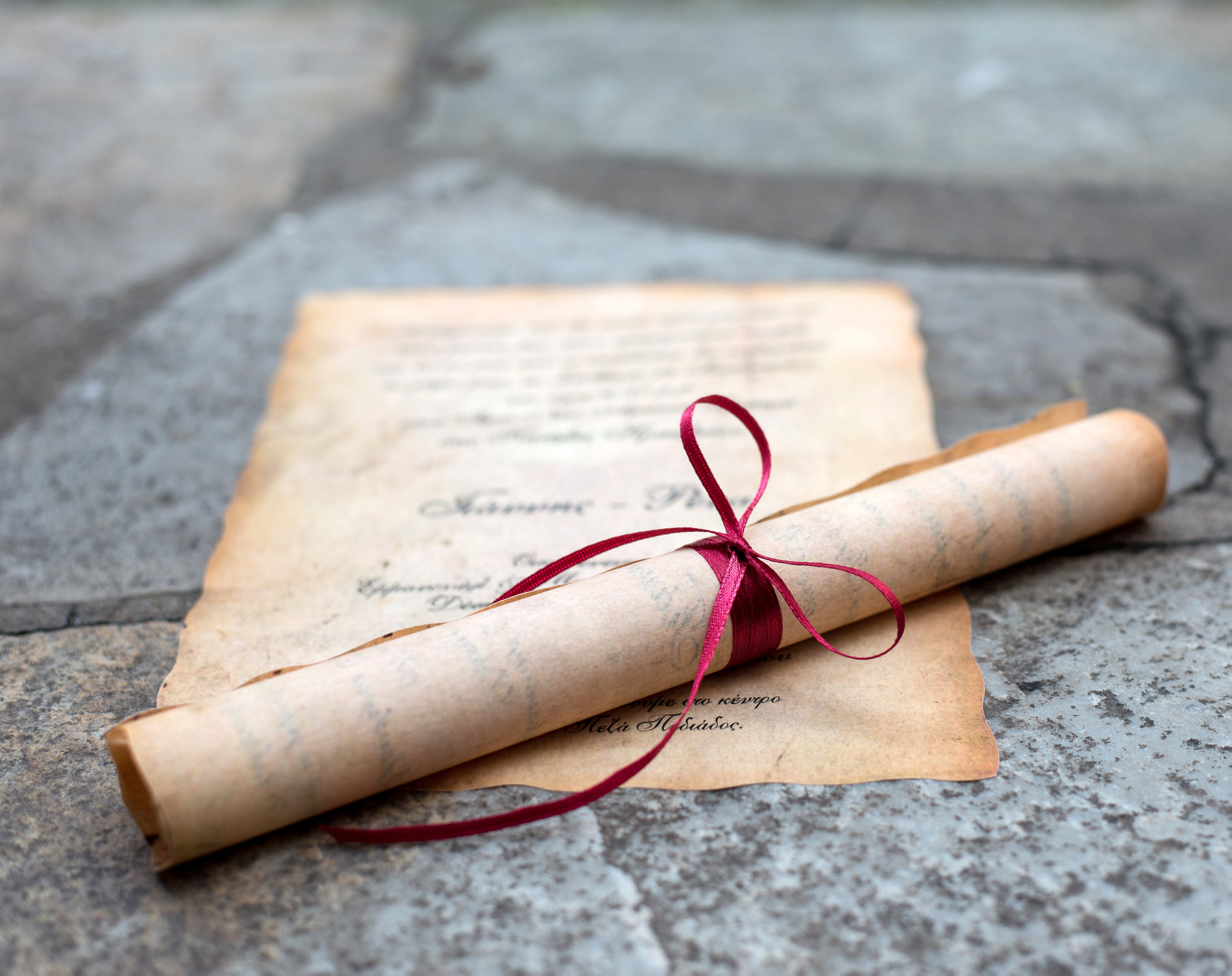 Ιδιαίτερο προσκλητήριο γάμου σε μορφή παπύρου, εμπνευσμένο από την παλιά εποχή και τη διαχρονική ρομαντική αισθητική.