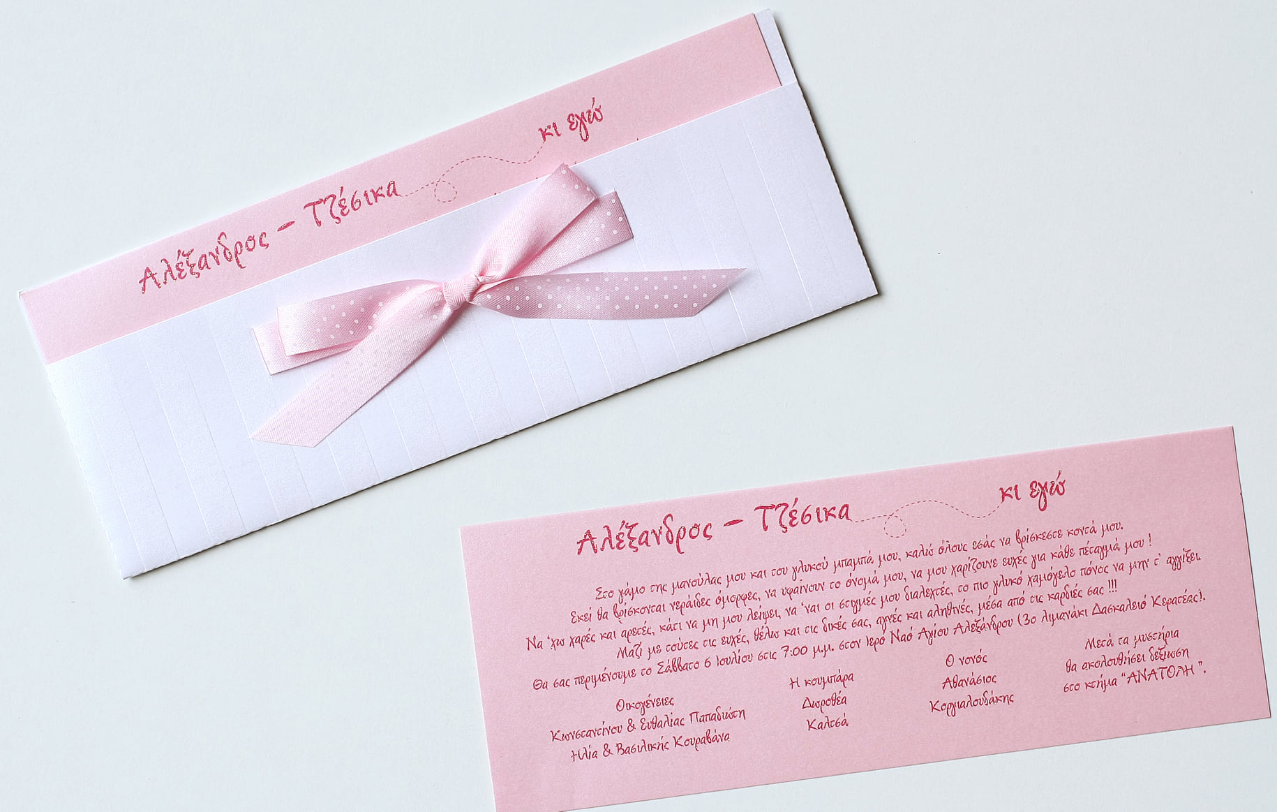 Ρομαντικό προσκλητήριο γάμου σε μακρόστενη διάσταση, σε απαλούς ροζ τόνους, ιδανικό για ζευγάρια που αγαπούν τη φινέτσα και τη διακριτική κομψότητα.