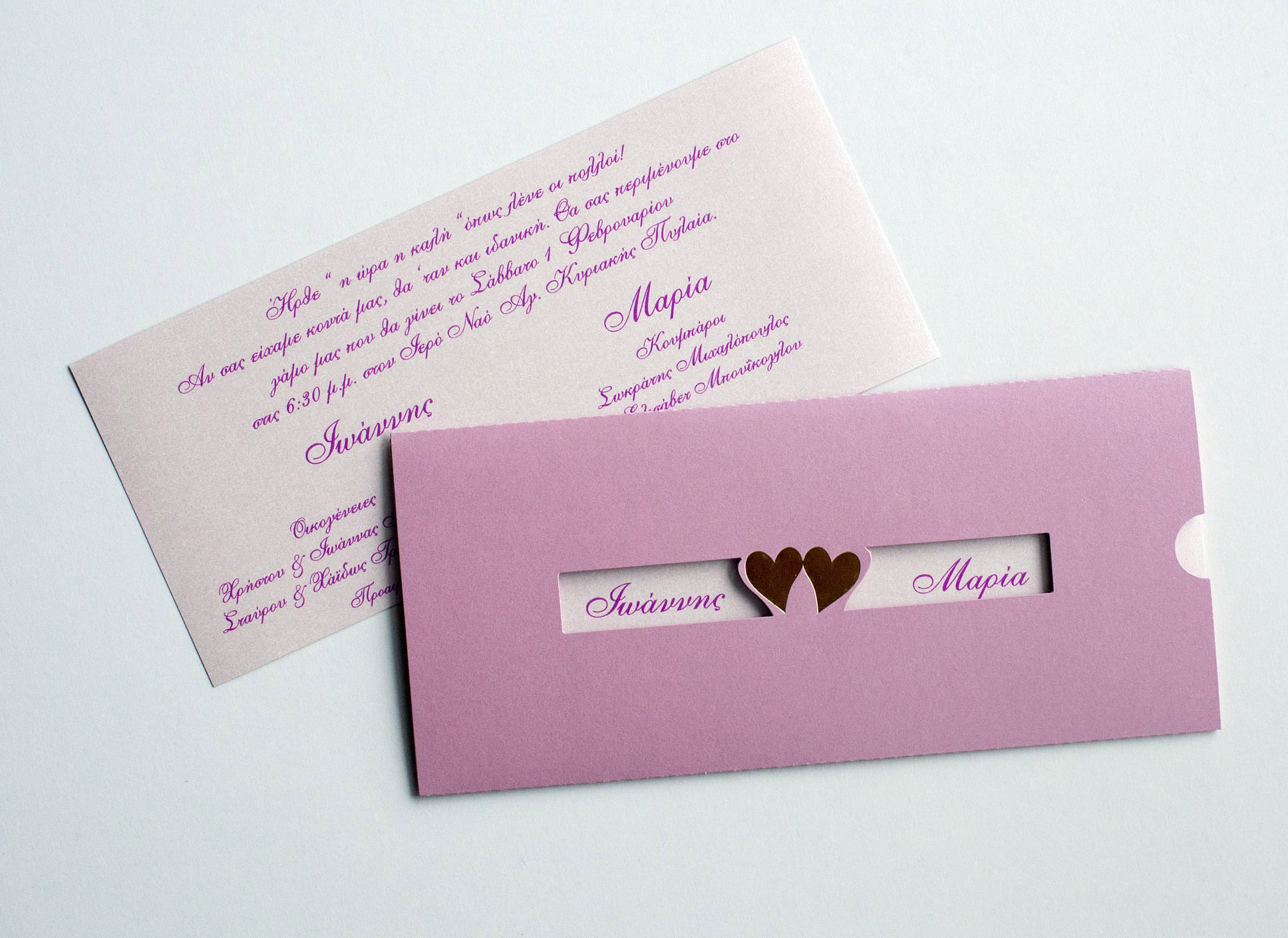 Ιδιαίτερο προσκλητήριο γάμου σε μακρόστενη διάσταση, σε απαλό ροζ τόνο, με κομψό κοπτικό παράθυρο που αποκαλύπτει τα ονόματα του ζευγαριού.