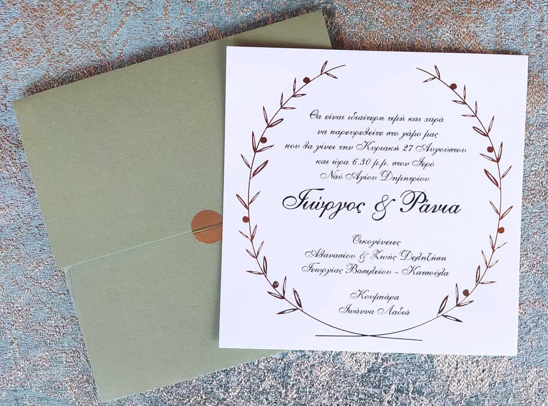 Ρομαντικό και διαχρονικό προσκλητήριο γάμου με botanical στεφάνι από κλαδιά ελιάς, που συμβολίζει την αγάπη, την ειρήνη και τη γονιμότητα. Η καθαρή λευκή κάρτα συνδυάζεται αρμονικά με φάκελο σε απαλή πράσινη απόχρωση ελιάς και στρογγυλό αυτοκόλλητο κλεισίματος σε γήινο τόνο. Ιδανική επιλογή για γάμους σε φυσικό, rustic ή boho στυλ.