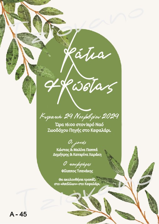 Μοντέρνο προσκλητήριο γάμου σε botanical αισθητική, με κυρίαρχο το πράσινο της ελιάς και φυσικά φύλλα σε watercolor ύφος. Το ιδιαίτερο καμπύλο σχήμα στο κέντρο του σχεδίου προσδίδει σύγχρονο χαρακτήρα, ενώ η καλλιγραφική γραμματοσειρά προσθέτει ρομαντισμό και κομψότητα.