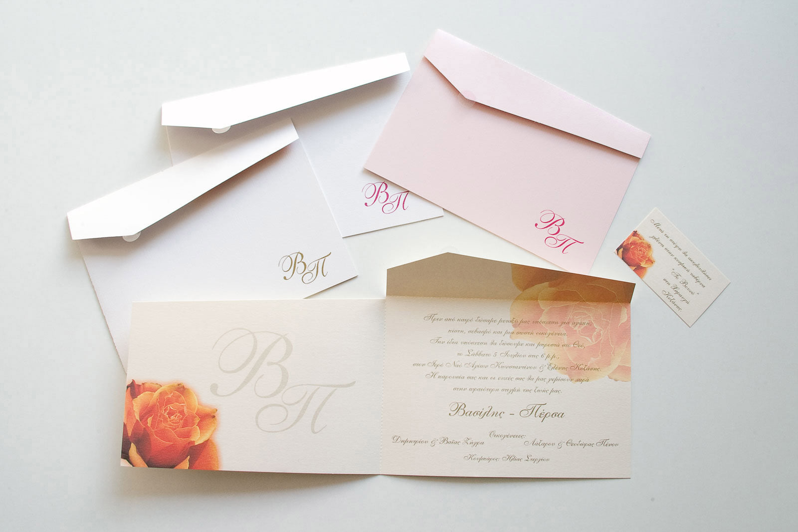 Το προσκλητήριο συνοδεύεται από matching φακέλους σε λευκό και απαλό ροζ, με μονόγραμμα του ζευγαριού, δημιουργώντας ένα ολοκληρωμένο και αρμονικό αποτέλεσμα υψηλής αισθητικής.