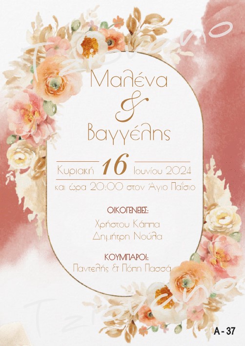 Ένα αριστοκρατικό προσκλητήριο γάμου με ρομαντική floral αισθητική και απαλά παστέλ χρώματα. Η καμπυλωτή σύνθεση (arch) στο κέντρο, πλαισιωμένη από ζωγραφισμένα λουλούδια σε ροζ, ροδακινί και nude αποχρώσεις, δημιουργεί ένα αποτέλεσμα γεμάτο κομψότητα, ζεστασιά και διαχρονικό ρομαντισμό.