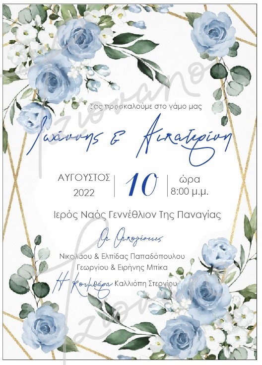 Ρομαντικό προσκλητήριο γάμου με υδατογραφημένα γαλάζια τριαντάφυλλα και διακριτικές χρυσές γεωμετρικές λεπτομέρειες, που αποπνέει κομψότητα και φρεσκάδα. Η σύνθεση συνδυάζει την ανθισμένη αισθητική με μοντέρνες γραμμές, ενώ η καλλιγραφική γραμματοσειρά στα ονόματα χαρίζει μία αίσθηση πολυτέλειας και προσωπικού χαρακτήρα.