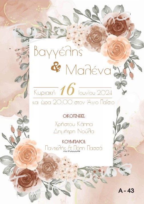 Ρομαντικό προσκλητήριο γάμου με εντυπωσιακή floral σύνθεση σε απαλές αποχρώσεις σάπιου ροζ, μπεζ και nude, που αγκαλιάζουν αρμονικά το κεντρικό πλαίσιο. Τα λουλούδια σε watercolor αισθητική, σε συνδυασμό με τη χρυσαφένια γραμματοσειρά, δημιουργούν ένα αποτέλεσμα φίνο, ζεστό και απόλυτα ρομαντικό.