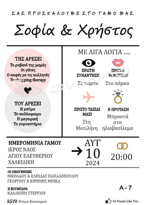 Πρωτότυπο και ευχάριστο προσκλητήριο γάμου με μοντέρνο σχεδιασμό και χιουμοριστικές λεπτομέρειες, ιδανικό για ζευγάρια που θέλουν να ξεφύγουν από τα κλασικά και να παρουσιάσουν την ιστορία τους με χαμόγελο.