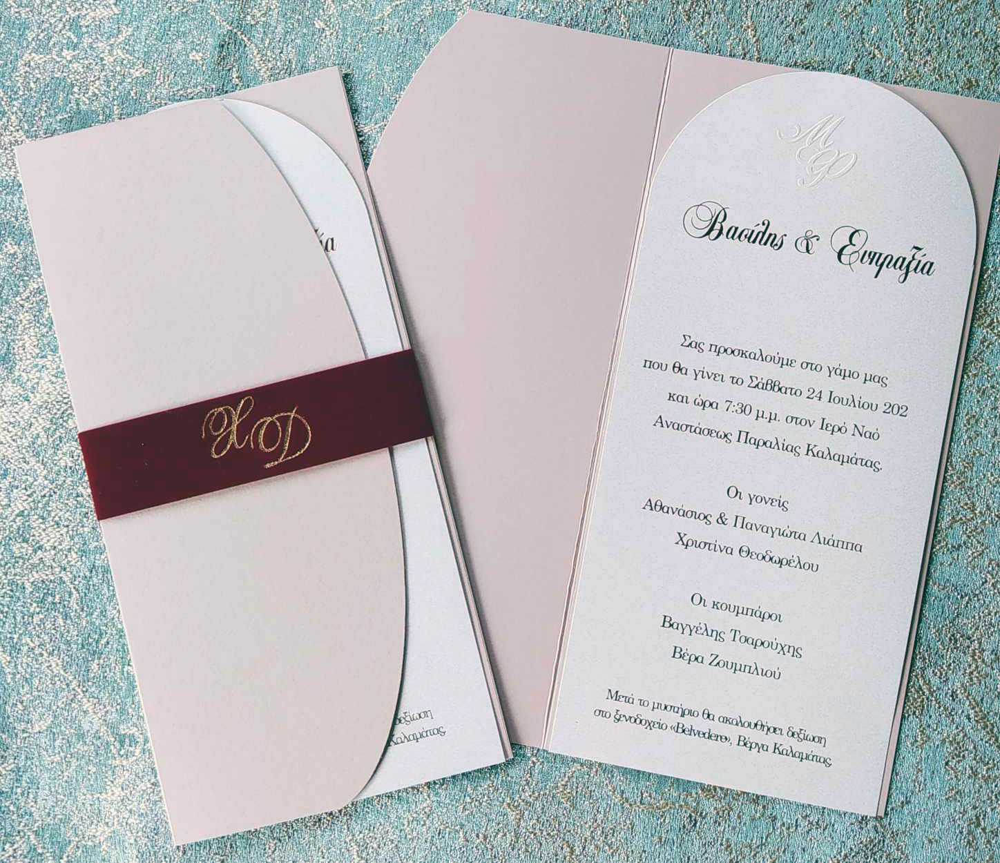 Κομψό και διαχρονικό προσκλητήριο γάμου με ιδιαίτερη καμπύλη κοπή, σε απαλές ivory–nude αποχρώσεις, που αποπνέει φινέτσα και αρχοντική απλότητα.