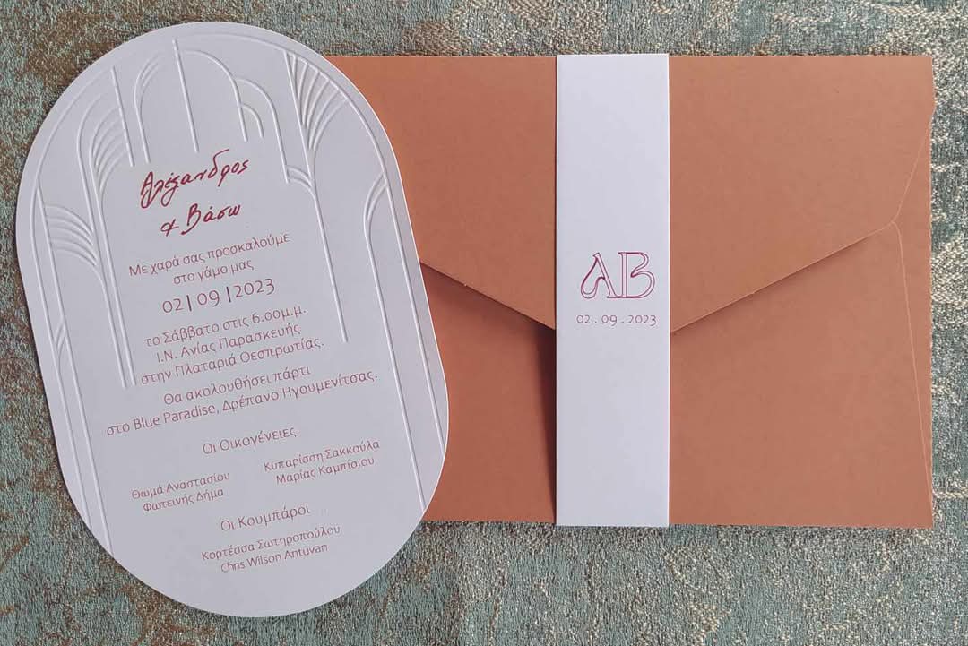 Κομψό και μοντέρνο προσκλητήριο γάμου σε minimal αισθητική, με ανάγλυφο διακοσμητικό σχέδιο και ιδιαίτερο οβάλ σχήμα. Συνοδεύεται από φάκελο σε γήινη απόχρωση τερακότα και κάθετη λευκή ζώνη με τα αρχικά του ζευγαριού, προσδίδοντας διαχρονική κομψότητα και υψηλή αισθητική. Ιδανική επιλογή για ζευγάρια που αγαπούν τη λιτότητα με ξεχωριστές λεπτομέρειες.