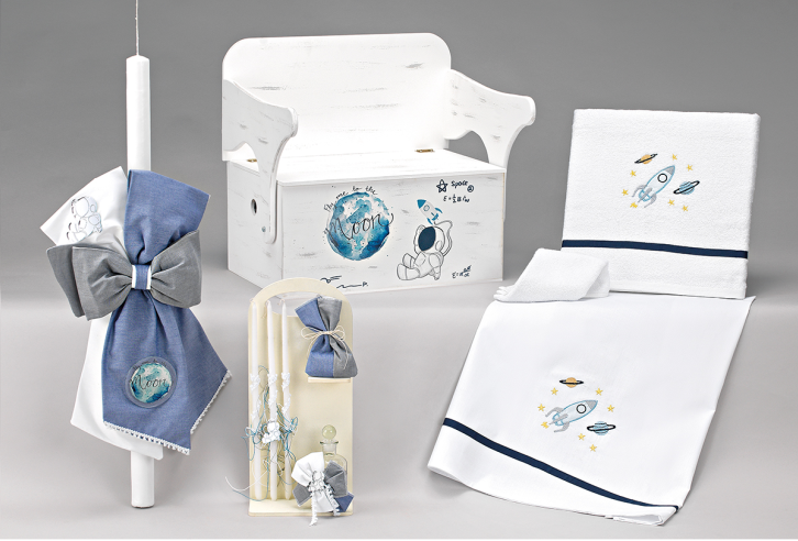 Το σετ ολοκληρώνεται με πλήρες λαδόπανο σε λευκή βάση με κέντημα πύραυλο, πετσέτες υψηλής ποιότητας και όλα τα απαραίτητα αξεσουάρ (μικρή λαμπάδα, σαπουνάκι και μπουκαλάκι λαδιού), όλα σε απόλυτη θεματική συνοχή.