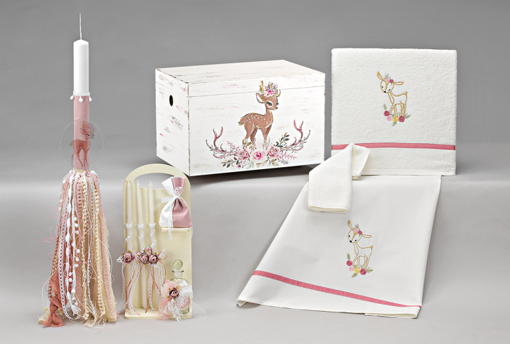Η λαμπάδα ξεχωρίζει με τα ιδιαίτερα διακοσμητικά κορδόνια και τις ρομαντικές λεπτομέρειες, ενώ το ξύλινο κουτί με την εκτύπωση του μικρού ελαφιού και τα λουλούδια αποτελεί ένα μοναδικό αναμνηστικό. Το σετ ολοκληρώνεται με κομψό λαδοσέτ και υφάσματα υψηλής ποιότητας, με διακριτικές εκτυπώσεις που δένουν αρμονικά με το θέμα.