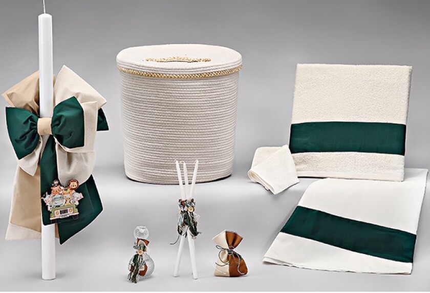 Το σετ ολοκληρώνεται με πλήρες λαδόπανο σε λευκή βάση με πράσινες λεπτομέρειες, πετσέτες υψηλής ποιότητας και τα απαραίτητα αξεσουάρ (μικρή λαμπάδα, σαπουνάκι και μπουκαλάκι λαδιού), όλα σε απόλυτη θεματική συνοχή.
