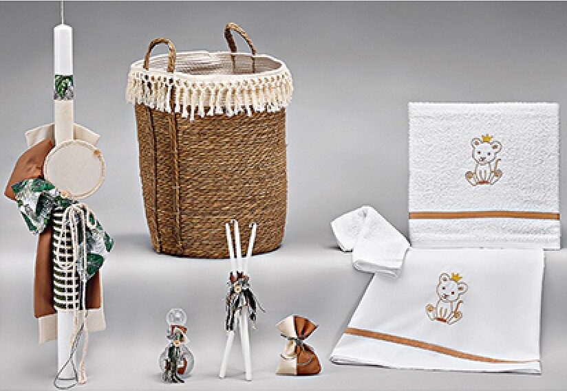 Το σετ περιλαμβάνει εντυπωσιακό ψάθινο καλάθι με κρόσσια, ιδανικό για αποθήκευση και διακόσμηση στο παιδικό δωμάτιο. Το πλήρες λαδόπανο σε λευκή βάση με κεντημένο λιονταράκι και διακριτικές λεπτομέρειες ολοκληρώνει αρμονικά το σύνολο. Συνοδεύεται από πετσέτες υψηλής ποιότητας και όλα τα απαραίτητα αξεσουάρ (μικρή λαμπάδα, σαπουνάκι και μπουκαλάκι λαδιού), όλα σε απόλυτη θεματική συνοχή.