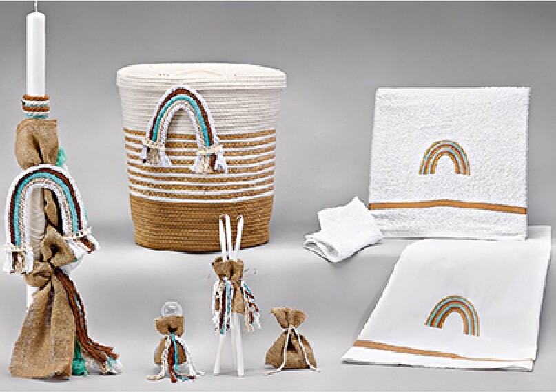 Το κουτί βάπτισης, επενδυμένο με σχοινί και φυσικά υλικά, ακολουθεί την ίδια boho φιλοσοφία, ενώ το πλήρες λαδόπανο σε λευκή βάση με διακριτικό ουράνιο τόξο ολοκληρώνει αρμονικά το σύνολο. Περιλαμβάνονται επίσης πετσέτες υψηλής ποιότητας και τα απαραίτητα αξεσουάρ (μικρή λαμπάδα, σαπουνάκι και μπουκαλάκι λαδιού), όλα δεμένα με φυσικά υλικά και αποχρώσεις.