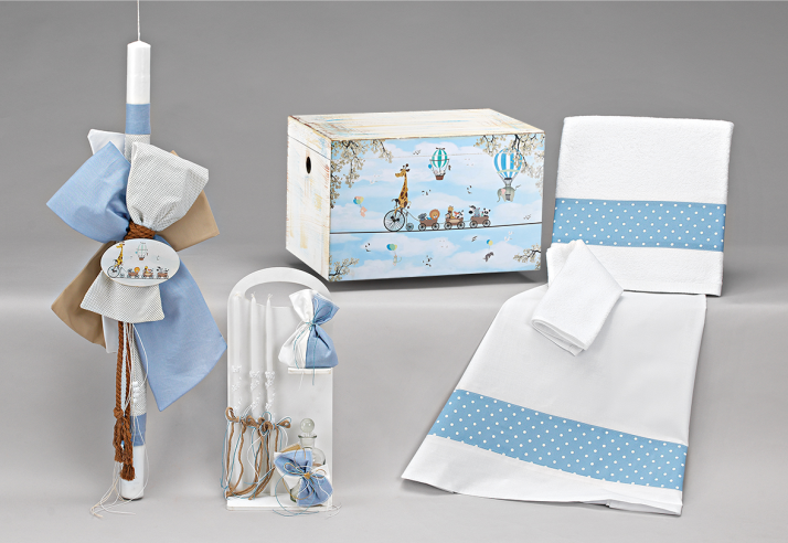 Το σετ ολοκληρώνεται με πλήρες λαδόπανο σε λευκή βάση με μπλε πουά λεπτομέρειες, πετσέτες υψηλής ποιότητας και όλα τα απαραίτητα αξεσουάρ (μικρή λαμπάδα, σαπουνάκι και μπουκαλάκι λαδιού), όλα σε απόλυτη αισθητική συνοχή.