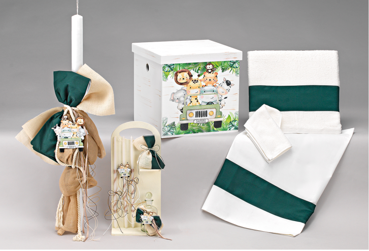 Ένα εντυπωσιακό και παιχνιδιάρικο σετ βάπτισης με θέμα το safari jeep, ιδανικό για μικρούς εξερευνητές! Σε αποχρώσεις πράσινου, μπεζ και λευκού, το σετ αποπνέει φυσικό στυλ και περιπέτεια.