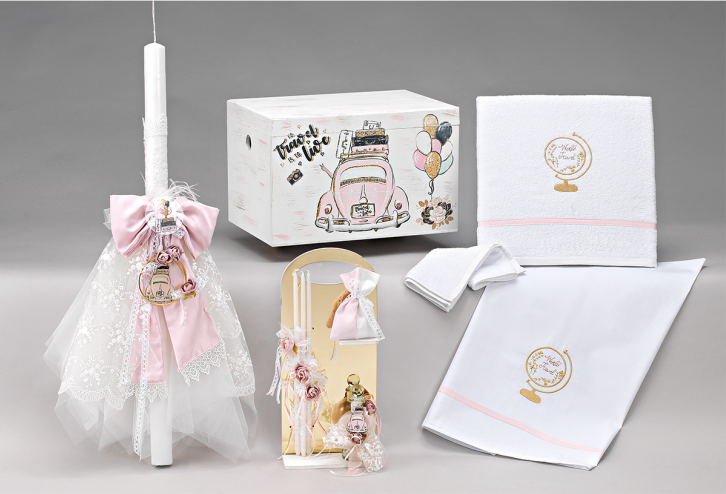 Η λαμπάδα είναι διακοσμημένη με δαντέλα, τούλι και ροζ λεπτομέρειες, ενώ το ξύλινο κουτί με την εκτύπωση vintage αυτοκινήτου αποτελεί ένα ιδιαίτερο κομμάτι που μπορεί να χρησιμοποιηθεί και ως αποθηκευτικός χώρος ή διακοσμητικό. Το σετ ολοκληρώνεται με κομψό λαδοσέτ και υφάσματα υψηλής ποιότητας με διακριτικά χρυσά μοτίβα.