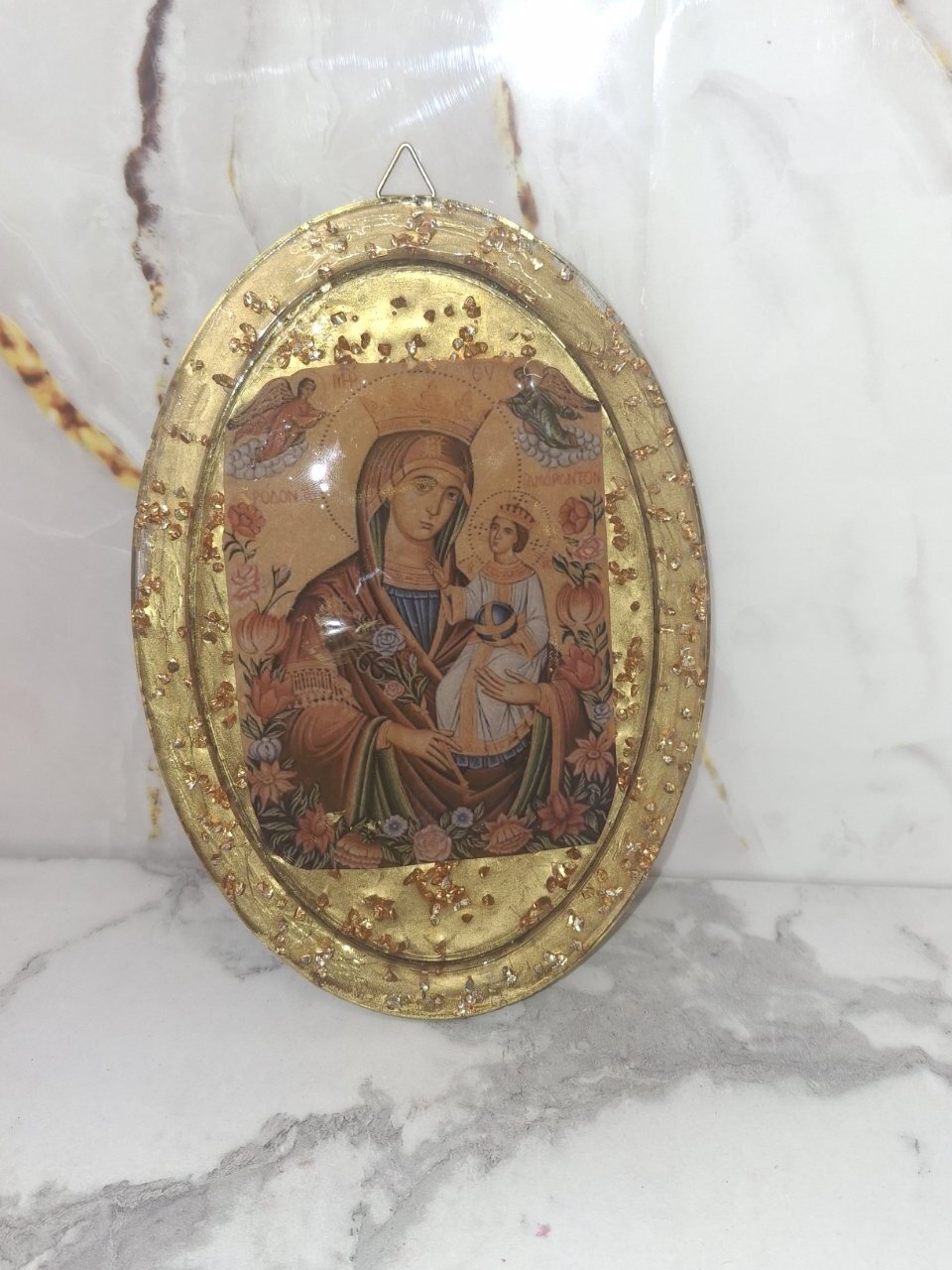 Μια υπέροχη, χειροποίητη οβάλ εικόνα της Παναγίας με το Θείο Βρέφος από υγρό γυαλί, διακοσμημένη με χρυσές λεπτομέρειες και ιριδίζον glitter για μια λαμπερή, ζεστή και ευλογημένη παρουσία στον χώρο.