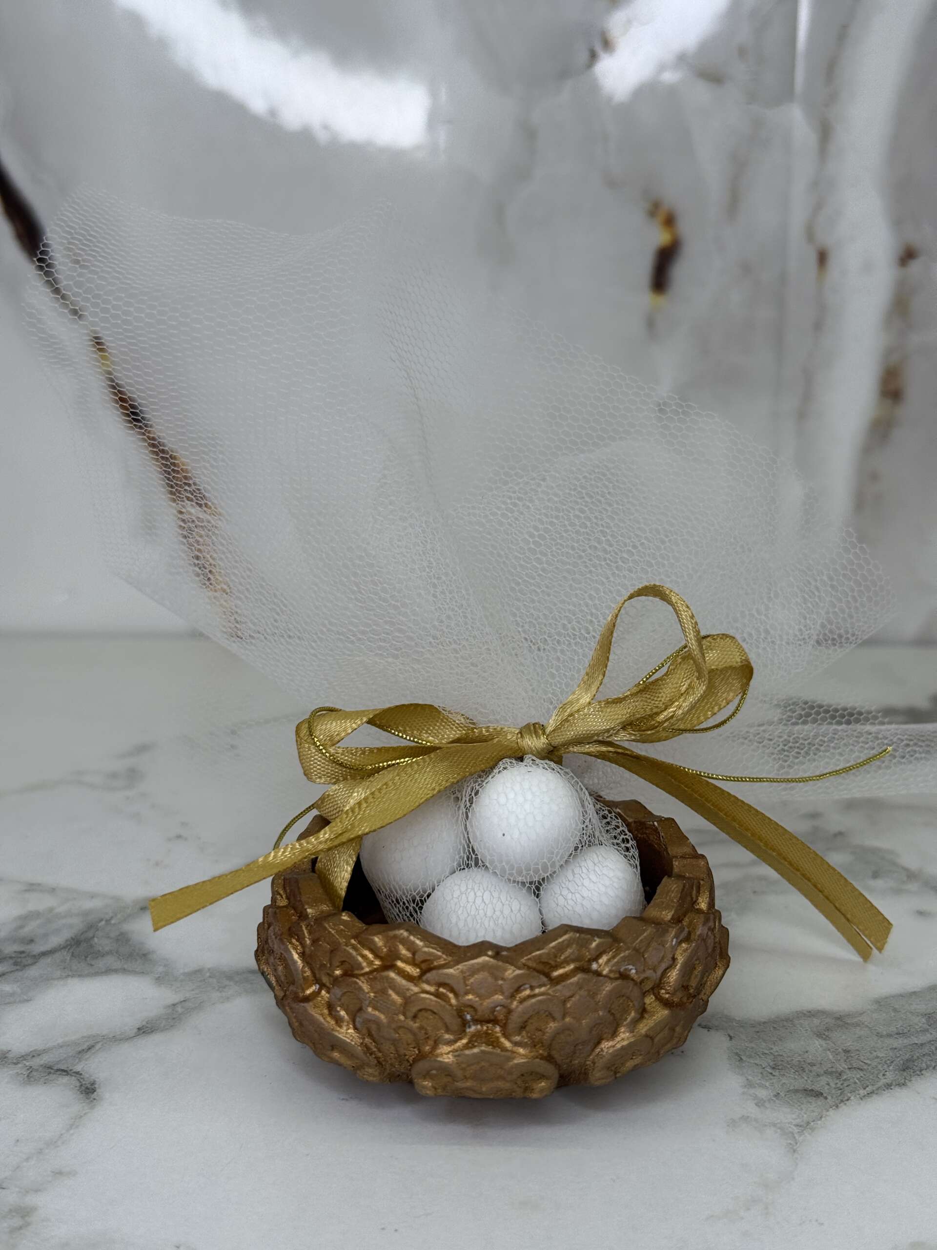 Χειροποίητη μπομπονιέρα σε διακοσμητικό μπωλάκι με ανάγλυφη υφή και μεταλλική χρυσή/μπρονζέ απόχρωση. Περιλαμβάνει λευκά κουφέτα, δεμένα σε φίνο τούλι και σατέν κορδέλα σε χρυσό χρώμα, προσφέροντας ένα κομψό και διαχρονικό αποτέλεσμα.