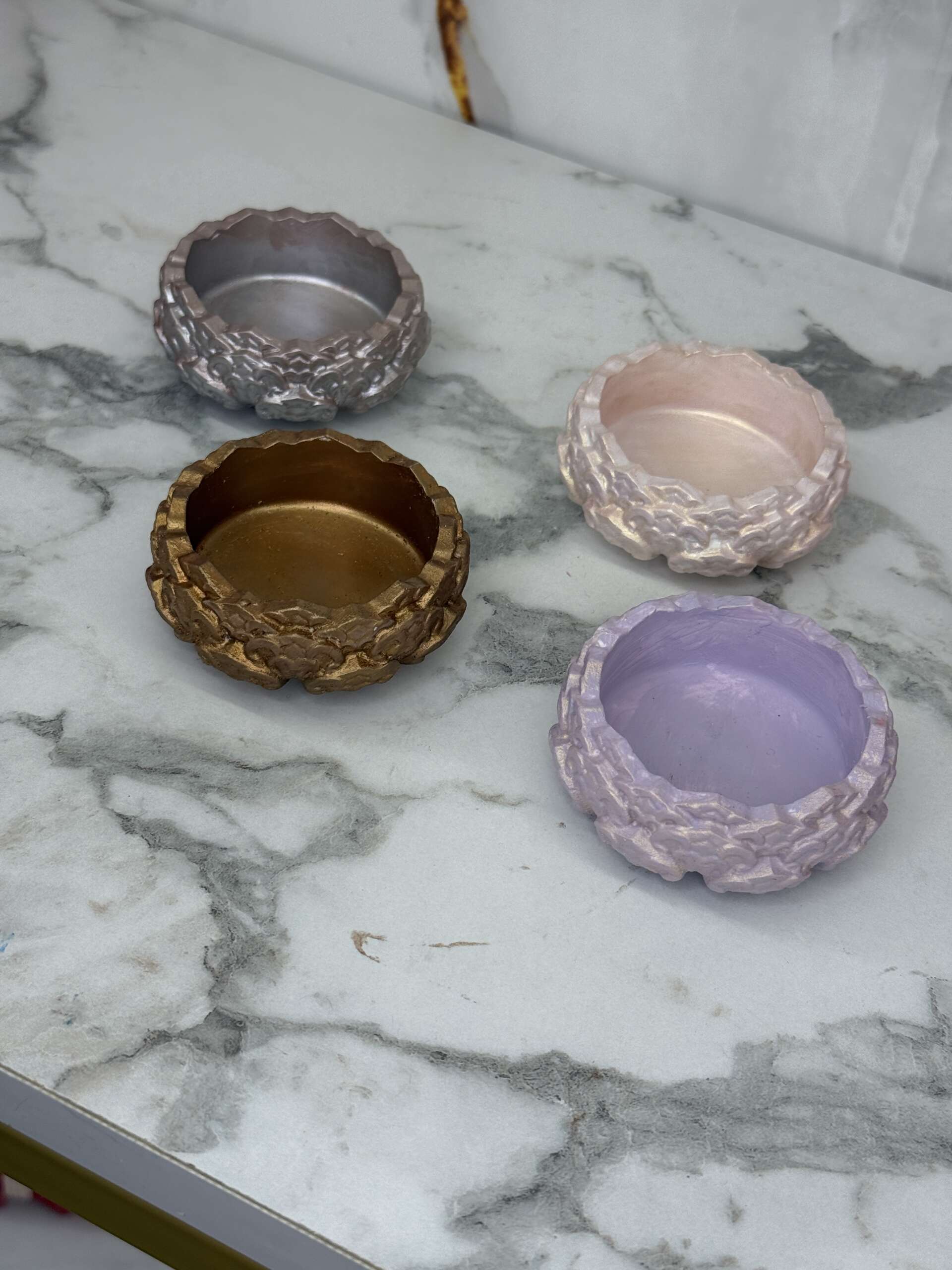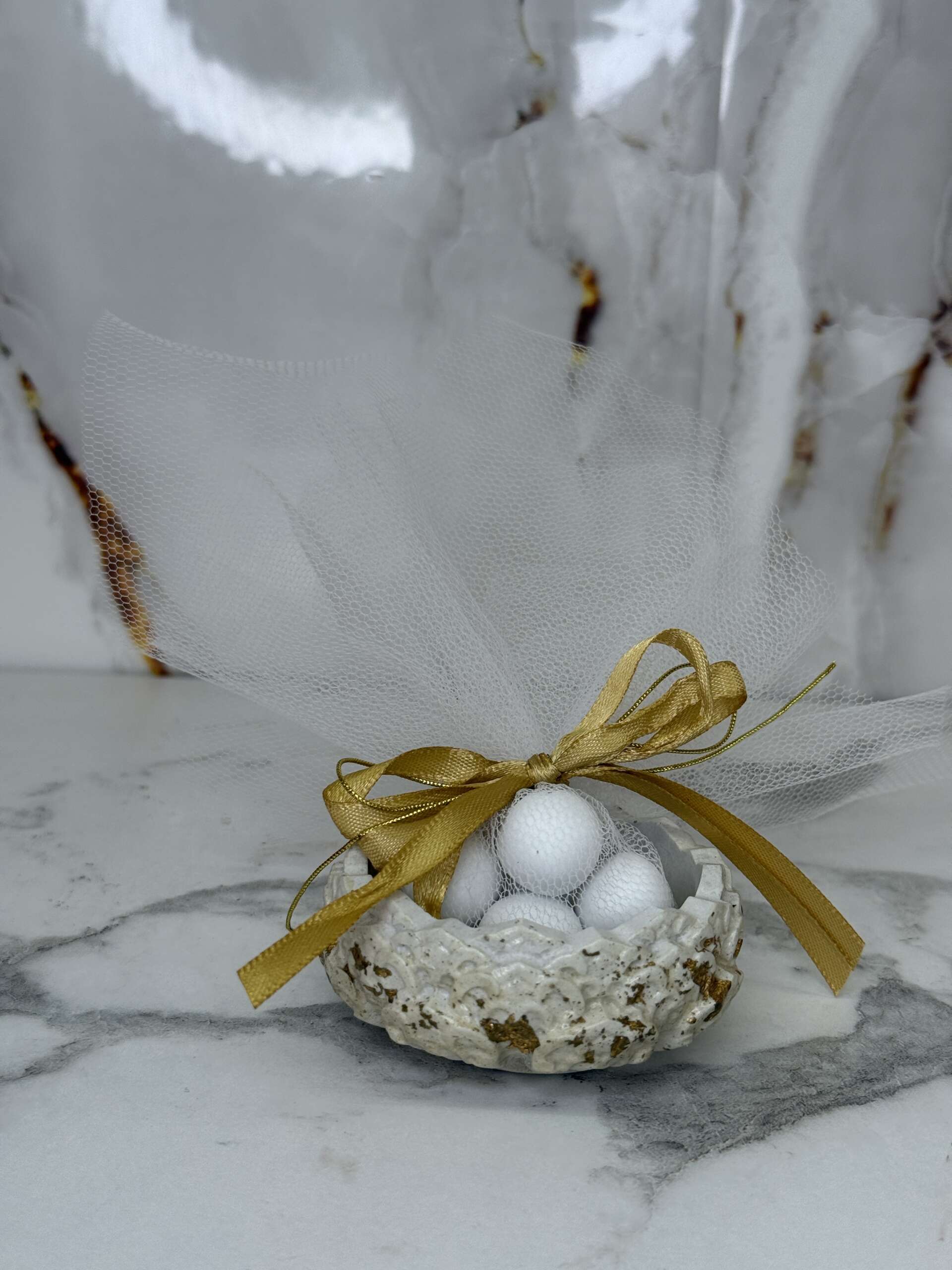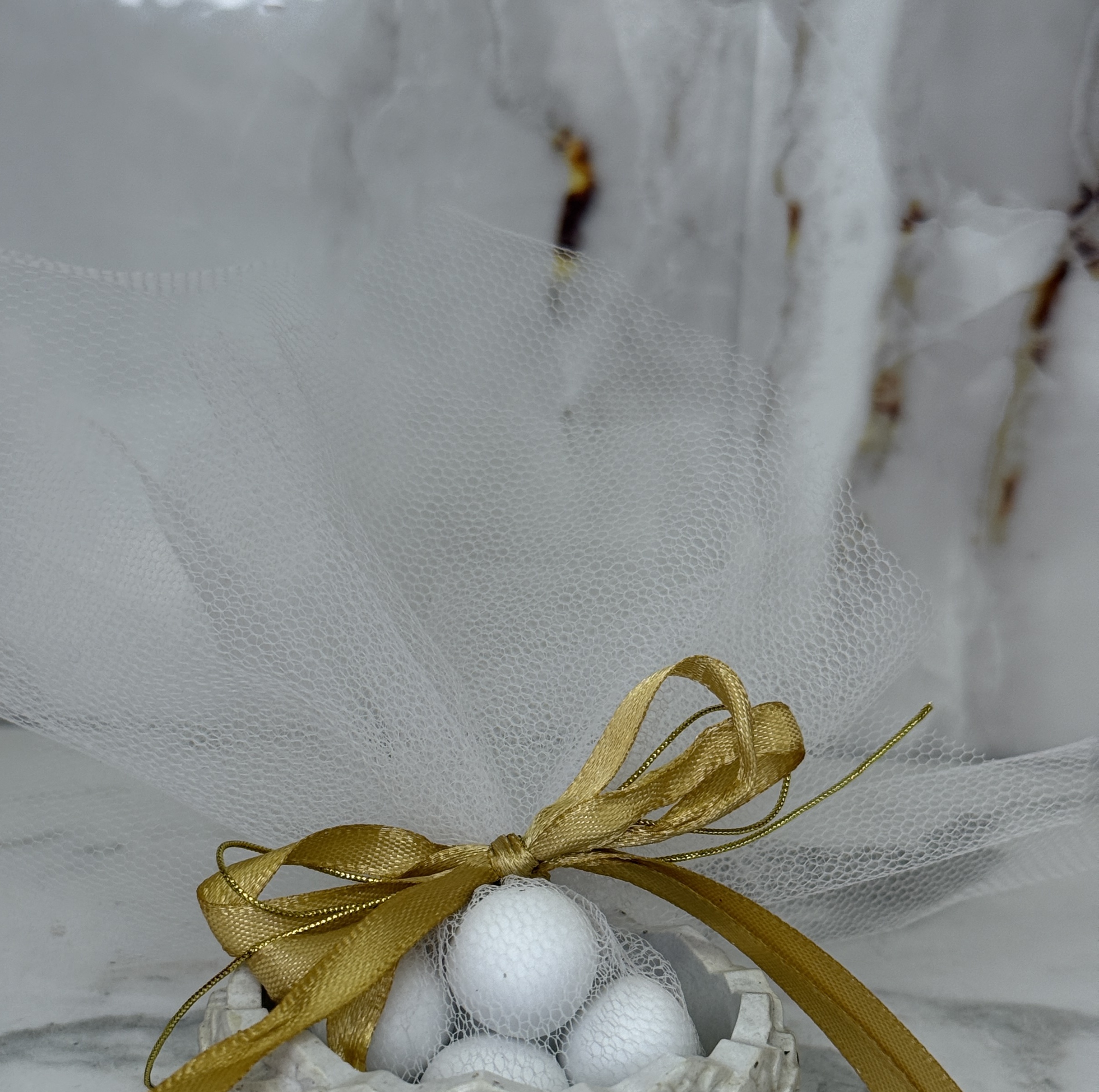 Χειροποίητη μπομπονιέρα σε κομψό διακοσμητικό πιατάκι πορσελάνης, με ανάγλυφη υφή και διακριτικές χρυσές λεπτομέρειες. Περιλαμβάνει λευκά κουφέτα, δεμένα με φίνο τούλι και σατέν κορδέλα σε χρυσή απόχρωση, δημιουργώντας ένα εκλεπτυσμένο και φωτεινό αποτέλεσμα.