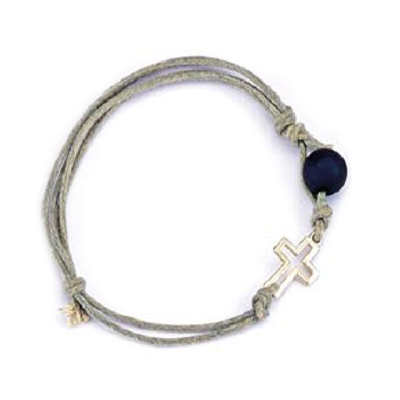 Χειροποίητο μαρτυρικό βραχιολάκι σε κομψό και διαχρονικό σχεδιασμό. Αποτελείται από γκρι κορδόνι με αυξομειούμενο κούμπωμα για άνετη εφαρμογή, διακοσμημένο με χρυσό σταυρουδάκι και σκούρα μπλε χάντρα που προσθέτουν μία ιδιαίτερη και μοντέρνα πινελιά.