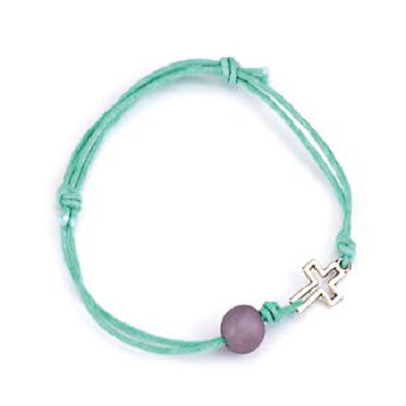 Χειροποίητο μαρτυρικό βραχιολάκι σε μοντέρνο και ξεχωριστό χρωματικό συνδυασμό. Αποτελείται από βεραμάν (μέντα) κορδόνι με αυξομειούμενο κούμπωμα για άνετη εφαρμογή, διακοσμημένο με ασημί σταυρουδάκι και μωβ χάντρα που χαρίζουν μία ιδιαίτερη και καλαίσθητη αντίθεση.
