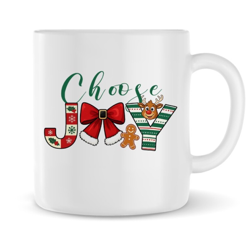 Λευκή κεραμική κούπα με ένα χαρούμενο, γιορτινό σχέδιο που γράφει – μια υπέροχη υπενθύμιση να επιλέγουμε τη χαρά κάθε μέρα!Τα γράμματα “J”, “O”, “Y” είναι στολισμένα με χριστουγεννιάτικες λεπτομέρειες: Χιονονιφάδες Γιορτινή κόκκινη κορδέλα Αξιαγάπητο ταρανδάκι Gingerbread ανθρωπάκι. Ένα δώρο που μοιράζει χαμόγελα!