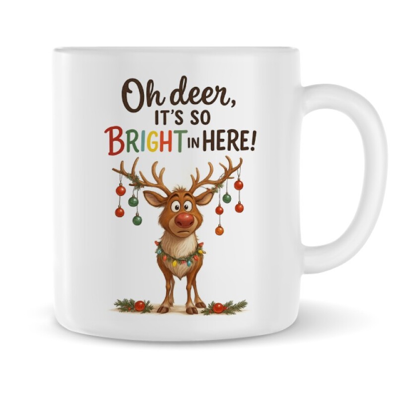 Το σχέδιο δείχνει ένα αξιαγάπητο ταρανδάκι με λαμπάκια και χριστουγεννιάτικες μπάλες κρεμασμένες στα κέρατά του, ενώ το κείμενο “Oh deer, it’s so bright in here!” προσθέτει μια παιχνιδιάρικη νότα γιορτής.