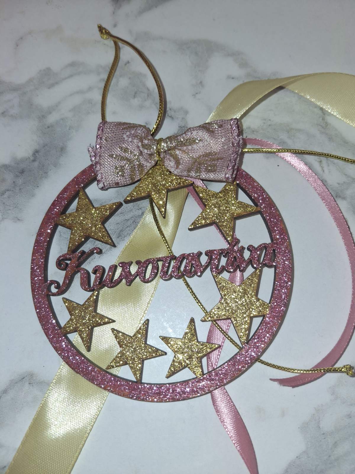 Ρομαντικό και κομψό χειροποίητο χριστουγεννιάτικο γούρι σε στρογγυλό σχέδιο γεμάτο αστεράκια.