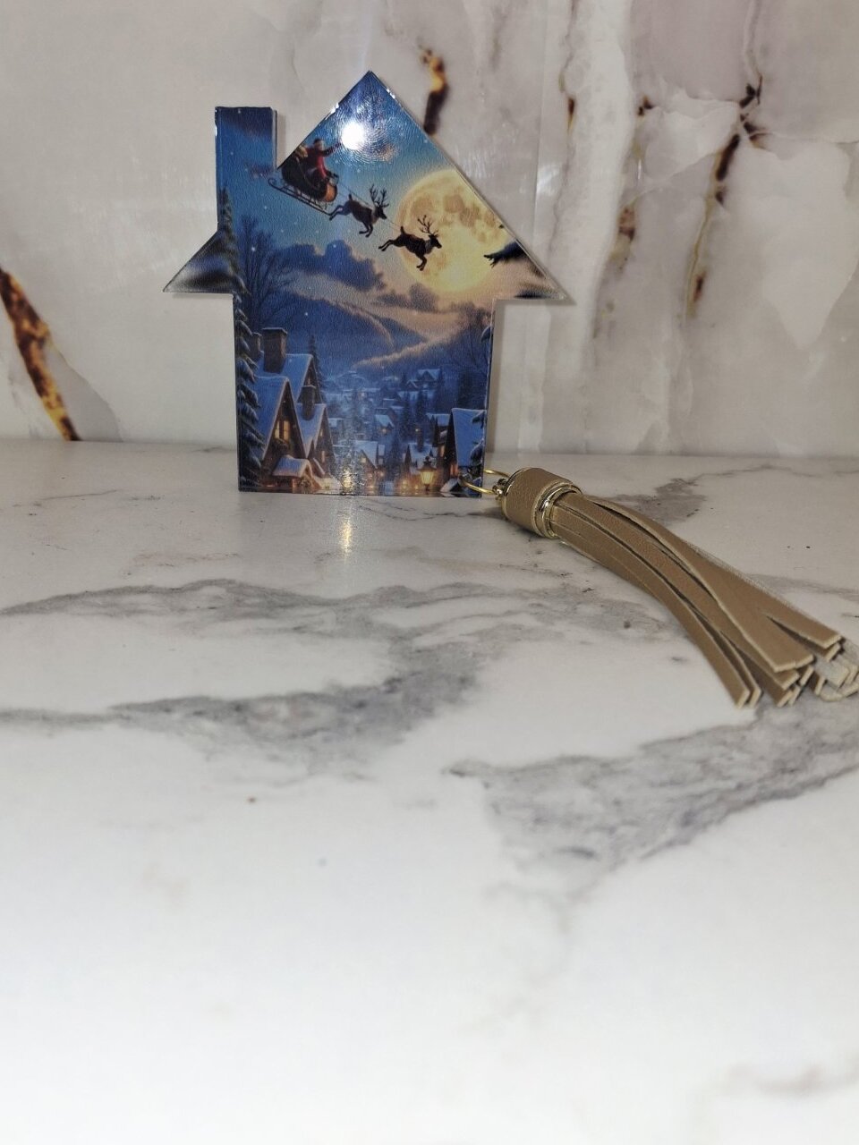 Ένα υπέροχο χειροποίητο διακοσμητικό σε σχήμα σπιτιού από πλέξιγκλας, με χριστουγεννιάτικη εικόνα υψηλής ευκρίνειας που απεικονίζει τον Άγιο Βασίλη με το έλκηθρο να πετά πάνω από ένα χιονισμένο χωριό. Συνδυάζεται με κομψή δερμάτινη φούντα σε μπεζ απόχρωση, που προσθέτει μοντέρνα και ζεστή αισθητική. Ιδανικό για δώρο. Ταιριάζει σε είσοδο, γραφείο, σαλόνι ή παιδικό δωμάτιο. Μπορεί να χρησιμοποιηθεί και ως χριστουγεννιάτικο δωράκι.