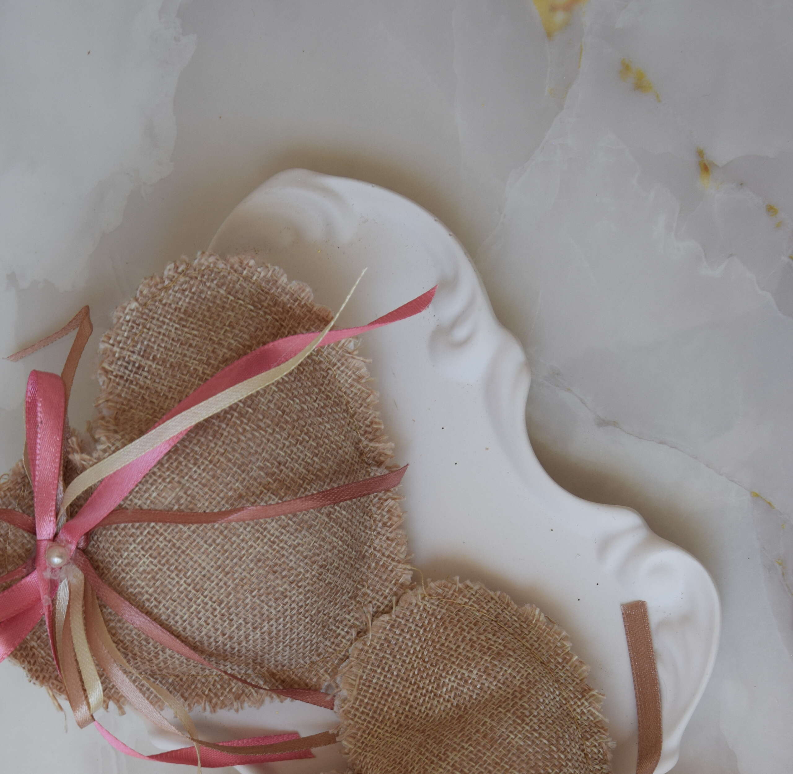 Μια υπέροχη χειροποίητη μπομπονιέρα σε σχήμα καρδιάς, φτιαγμένη από φυσική λινάτσα. Διακοσμείται με φιόγκους σε αποχρώσεις ροζ, σάπιο μήλο και ιβουάρ, ολοκληρωμένους με μία μικρή πέρλα στο κέντρο.
