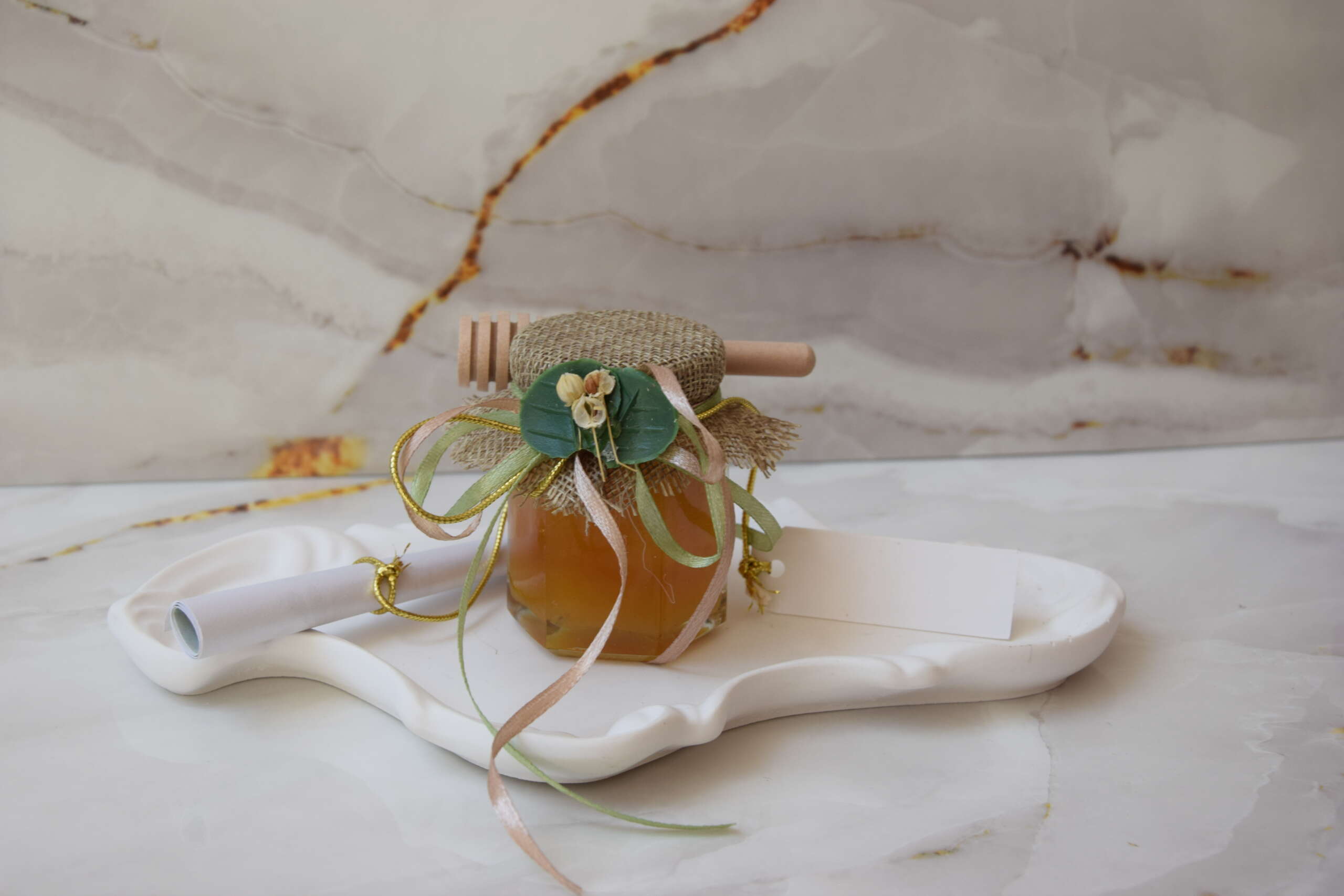 Συνοδεύεται από ξύλινη μελιέρα για extra φινέτσα. Μια ιδιαίτερη και γλυκιά πρόταση που εντυπωσιάζει καλεσμένους σε γάμο ή βάπτιση.