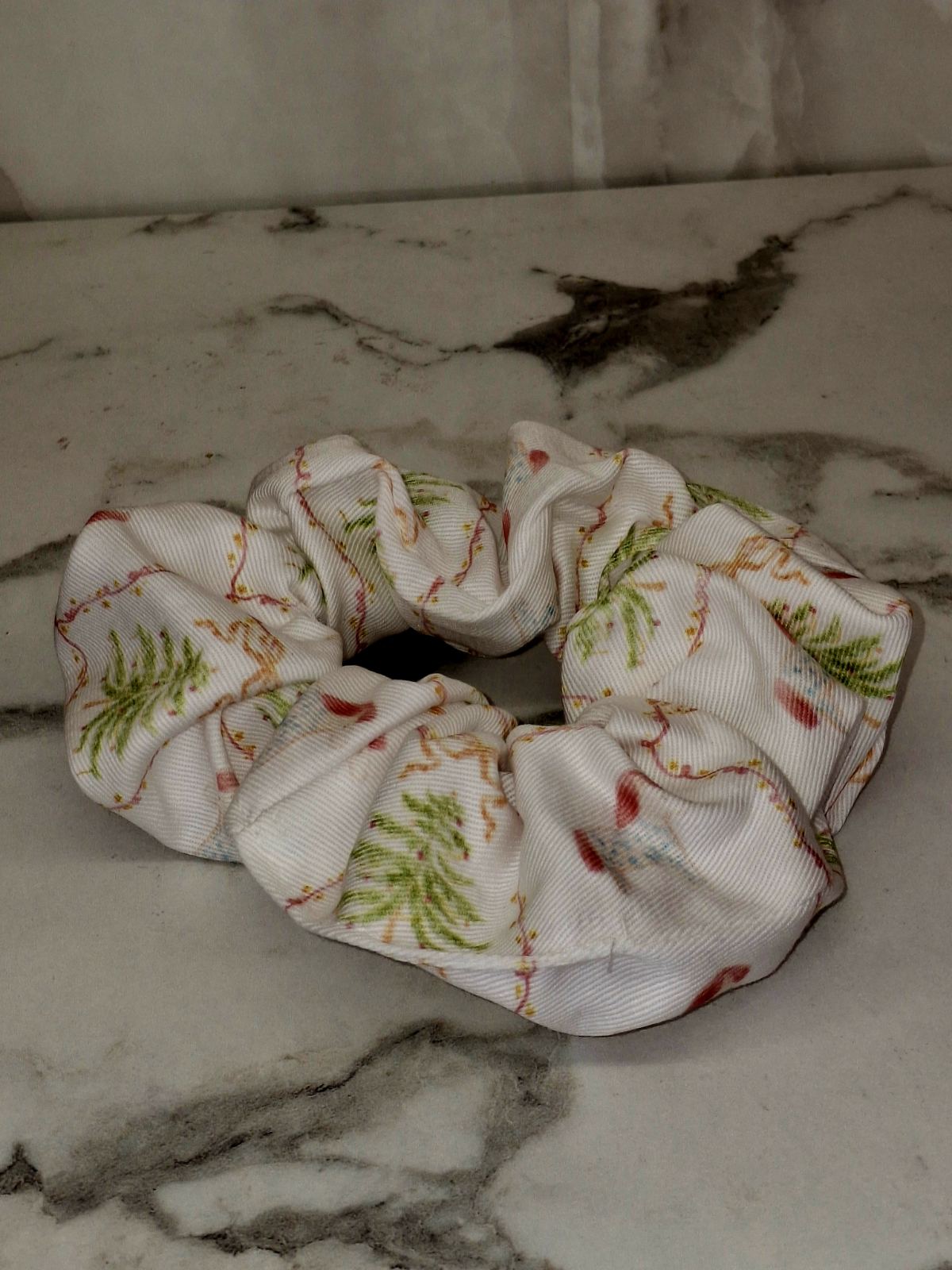 Ένα γλυκό και ανάλαφρο scrunchie σε λευκή βάση, διακοσμημένο με χριστουγεννιάτικα δεντράκια, γιρλάντες και απαλά γιορτινά χρώματα.